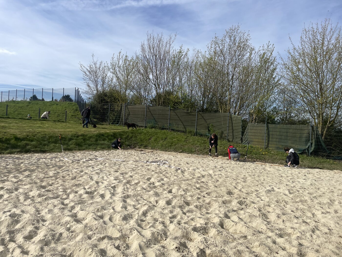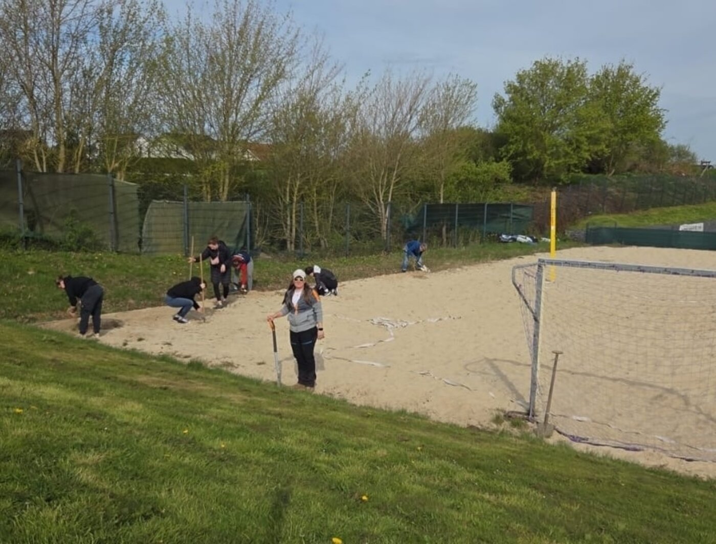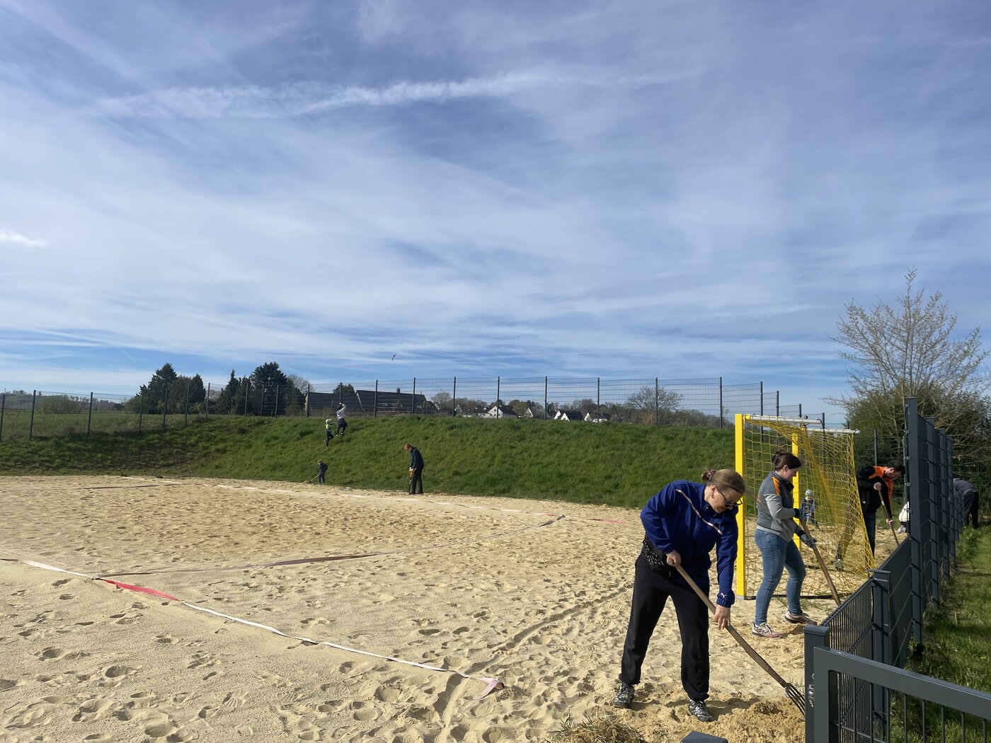 Durch die Erweiterung auf zwei Beachplätze ist der Aufwand in diesem Jahr deutlich gestiegen. Hauptaufgabe war es, das Gras und Unkraut zu entfernen, das über den Winter in die Sandflächen gewachsen war. Zusätzlich wurden die Volleyballpfosten aufgebaut, sodass die Plätze nun wieder bereit für Training und Spiele sind.